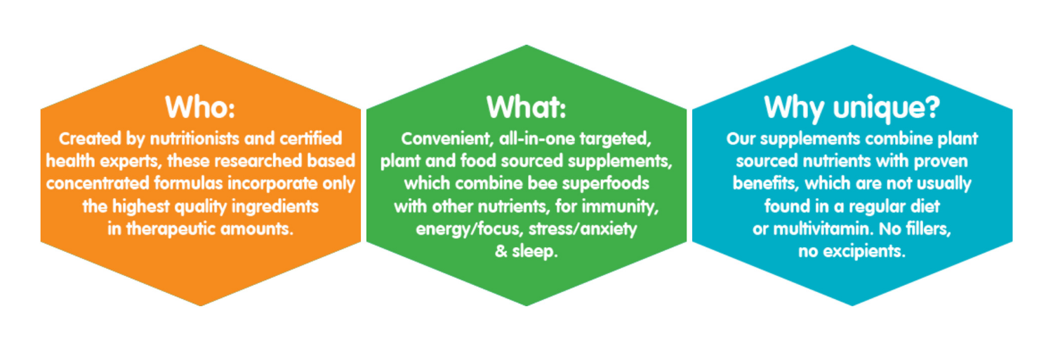 Unbeelievable Health is one of the only brands marrying the amazing substances bees produce (propolis, bee pollen & royal jelly) with synergistic plant, food and botanical sourced ingredients (many of which bees pollinate!) - a combination of nature’s finest nutrients from hives, fields and forests.